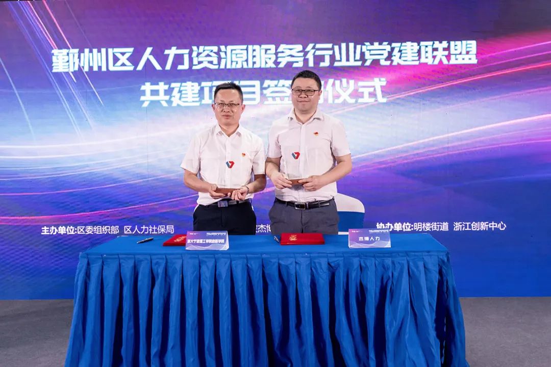 为推进公司高水平创新人才培养,加强员工创新创业教育,促进体育艺术教育交流合作,2022年6月17日下午,公司党支部在鄞州区人力资源服务行业党委成立仪式暨人力资源服务行业党建联盟“益企•鄞未来”活动上与2022年浙商全国500强宁波杰博人力资源有限公司党支部共建党建联盟。